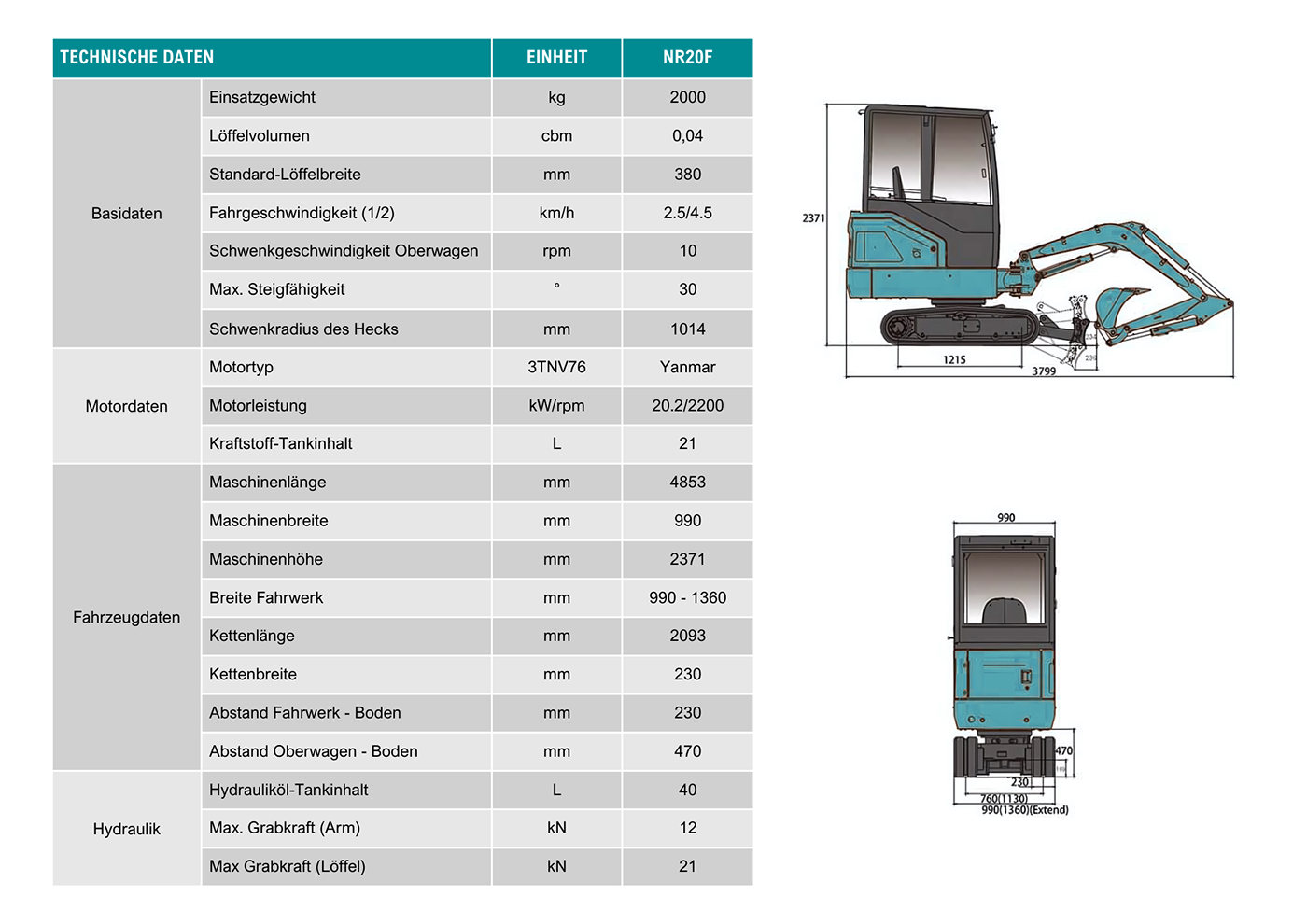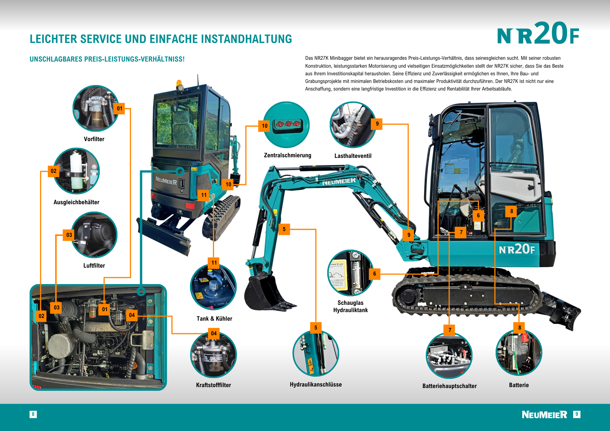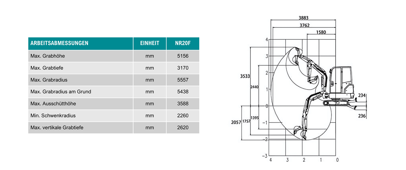 Der NR 20F Minibagger bietet ein herausragendes Preis-Leistungs-Verhältnis, dass seinesgleichen sucht. Mit seiner robusten Konstruktion, leistungsstarken Motorisierung und vielseitigen Einsatzmöglichkeiten stellt der NR 20F sicher, dass Sie das Beste aus Ihrem Investitionskapital herausholen. Seine Effizienz und Zuverlässigkeit ermöglichen es Ihnen, Ihre Bau- und Grabungsprojekte mit minimalen Betriebskosten und maximaler Produktivität durchzuführen. Der NR 20F ist nicht nur eine Anschaffung, sondern eine langfristige Investition in die Effizienz und Rentabilität Ihrer Arbeitsabläufe.